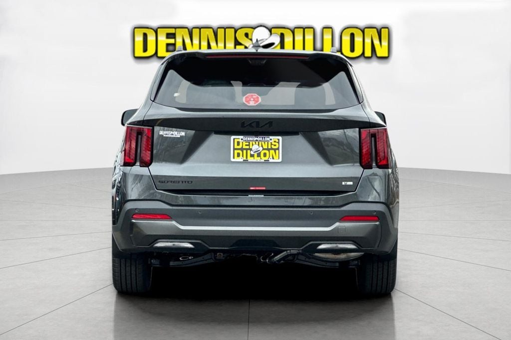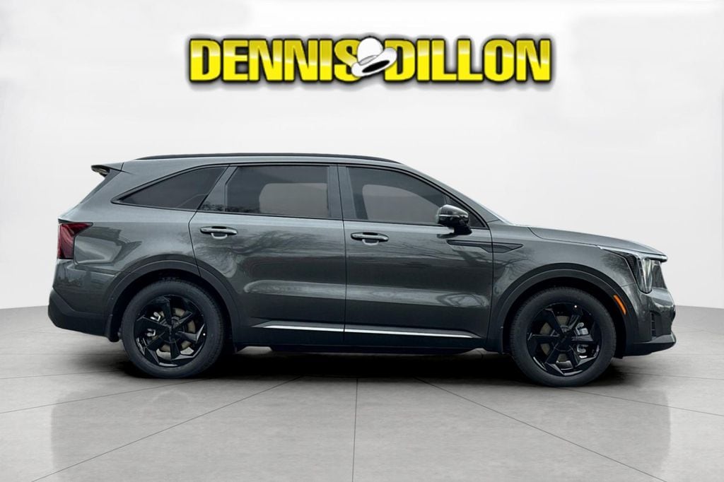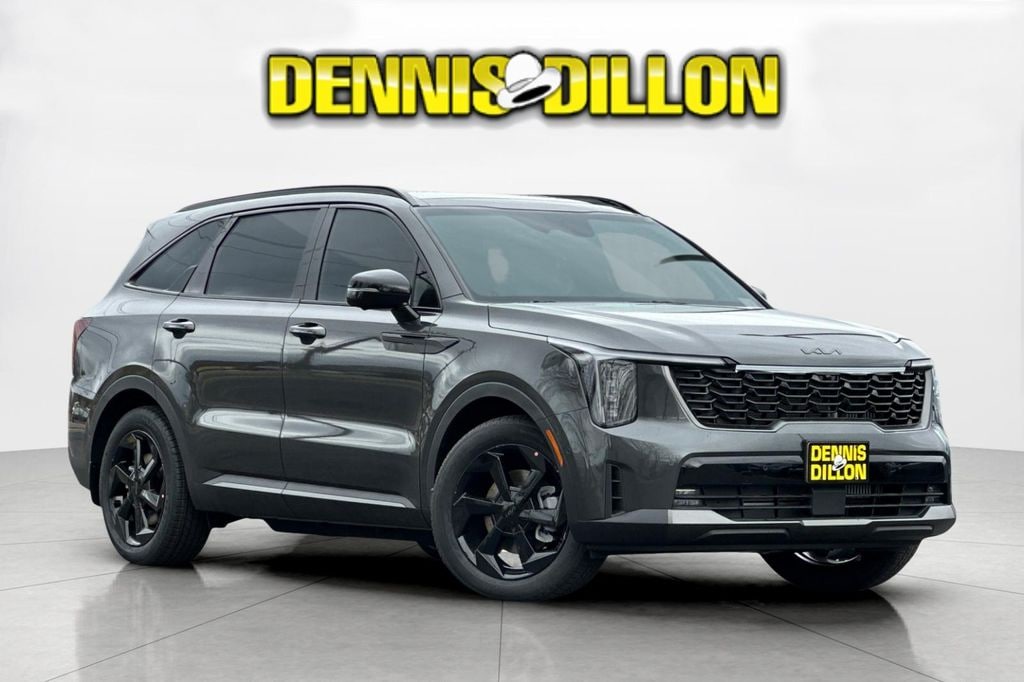 Interstellar Gray 2026 Kia Sorento Hybrid X-Line SX Prestige AWD 6-Speed Automatic 1.6L Turbo GDI 4-Cylinder 12 Speakers, 3rd row seats: split-bench, 4-Wheel Disc Brakes, ABS brakes, Air Conditioning, All Weather Floor Mats, Alloy wheels, AM/FM radio: SiriusXM, Apple CarPlay & Android Auto, Auto High-beam Headlights, Auto-dimming Rear-View mirror, Automatic temperature control, Brake assist, Bumpers: body-color, Delay-off headlights, Driver door bin, Driver vanity mirror, Dual front impact airbags, Dual front side impact airbags, Electronic Stability Control, Emergency communication system: 911 Connect, Exterior Parking Camera Rear, Four wheel independent suspension, Front anti-roll bar, Front Bucket Seats, Front Center Armrest, Front dual zone A/C, Front fog lights, Front reading lights, Fully automatic headlights, Garage door transmitter: HomeLink, Heated and Ventilated Front Bucket Seats, Heated door mirrors, Heated front seats, Heated rear seats, Heated steering wheel, Illuminated entry, Knee airbag, Leather steering wheel, Low tire pressure warning, Memory seat, Mudguards, Navigation System, Occupant sensing airbag, Outside temperature display, Overhead airbag, Overhead console, Panic alarm, Passenger door bin, Passenger vanity mirror, Perforated Genuine Leather Seat Trim, Power door mirrors, Power driver seat, Power Liftgate, Power moonroof, Power passenger seat, Power steering, Power windows, Radio data system, Radio: AM/FM/SiriusXM Audio System, Rain sensing wipers, Rear anti-roll bar, Rear reading lights, Rear side impact airbag, Rear window defroster, Rear window wiper, Remote keyless entry, Security system, Small First Aid Kit, Speed control, Speed-sensing steering, Split folding rear seat, Spoiler, Steering wheel mounted audio controls, Tachometer, Telescoping steering wheel, Tilt steering wheel, Traction control, Trip computer, Turn signal indicator mirrors, Variably intermittent wipers, Ventilated front seats, Wheels: 19" Machine-Finished Aero Alloy.