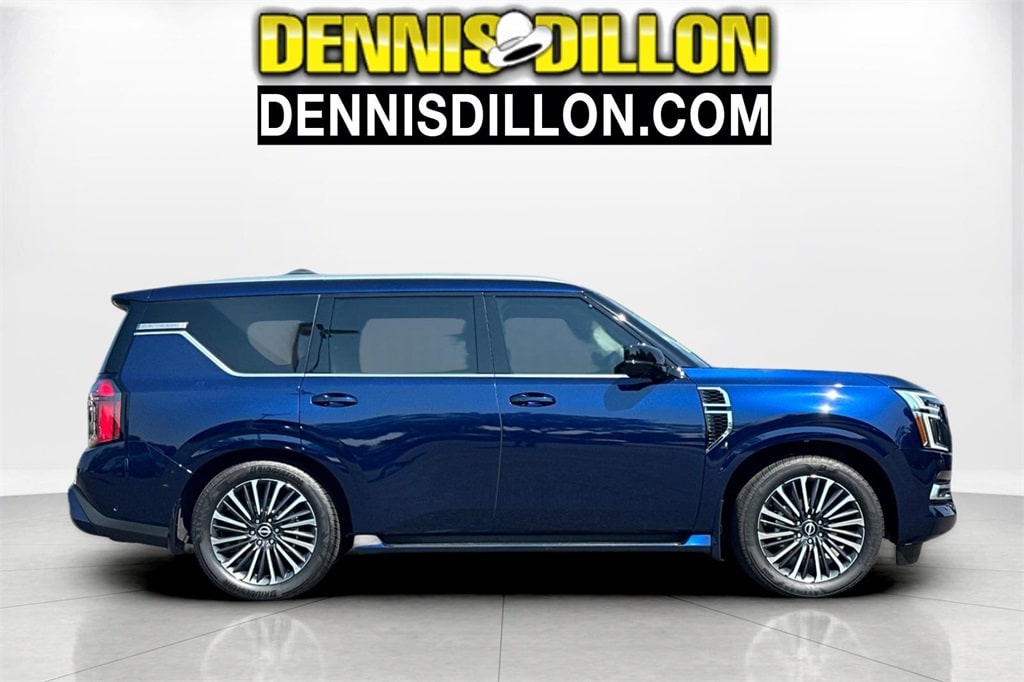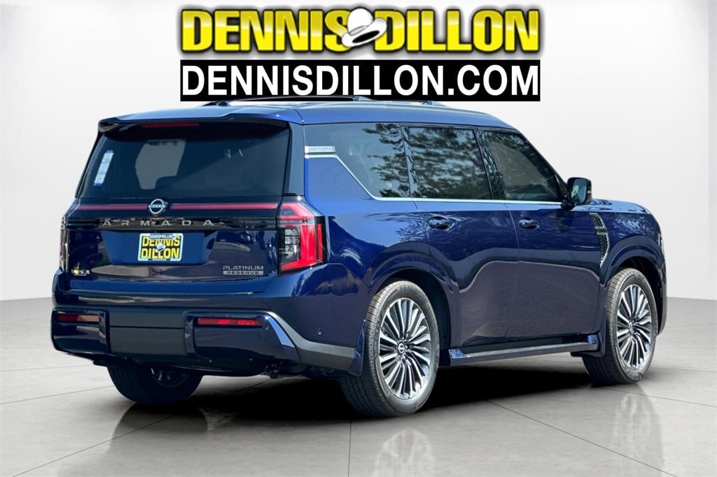 Deep Ocean Blue Pearl 2025 Nissan Armada Platinum 4D Sport Utility 4WD 9-Speed Automatic 3.5L DOHC 12 Speakers, 2nd-Row Split Bench Seat w/40/20/40-Split Folding, 3rd row seats: split-bench, 4-Wheel Disc Brakes, ABS brakes, Adaptive suspension, Air Conditioning, Alloy wheels, AM/FM radio: SiriusXM, Anti-whiplash front head restraints, Auto High-beam Headlights, Auto tilt-away steering wheel, Auto-dimming door mirrors, Auto-dimming Rear-View mirror, Auto-leveling suspension, Automatic temperature control, Brake assist, Bumpers: body-color, Carpeted Floor Mats - Bench Seat, Center Armrest w/2 Cupholders, Climate Controlled Heated & Ventilated Front Seats, Delay-off headlights, Driver door bin, Driver vanity mirror, Dual front impact airbags, Dual front side impact airbags, Electronic Stability Control, Emergency communication system: NissanConnect Services, EZ Flex 2nd-Row Seating System w/1-Touch Release, Four wheel independent suspension, Front anti-roll bar, Front Bucket Seats, Front Center Armrest, Front dual zone A/C, Front fog lights, Front reading lights, Fully automatic headlights, Garage door transmitter: myQ Connected Garage, Genuine wood dashboard insert, Heads-Up Display, Heated door mirrors, Heated front seats, Heated rear seats, Heated steering wheel, HVAC memory, Illuminated entry, Illuminated Kick Plates, Knee airbag, Leather steering wheel, Low tire pressure warning, Memory seat, Navigation System, Occupant sensing airbag, Outside temperature display, Overhead airbag, Overhead console, Panic alarm, Passenger door bin, Passenger vanity mirror, Power door mirrors, Power driver seat, Power Liftgate, Power moonroof, Power passenger seat, Power steering, Power windows, Quilted Leather Seat Trim, Radio: NissanConnect w/SiriusXM 360L, Rain sensing wipers, Rear air conditioning, Rear anti-roll bar, Rear Bumper Protector, Rear reading lights, Rear window defroster, Rear window wiper, Reclining 3rd row seat, Remote keyless entry, Roof Rail Cross Bars, Security system, Speed control, Speed-sensing steering, Speed-Sensitive Wipers, Splash Guards, Split Bench Seat Package, Split folding rear seat, Spoiler, Steering wheel memory, Steering wheel mounted audio controls, Tachometer, Telescoping steering wheel, Tilt steering wheel, Traction control, Trip computer, Turn signal indicator mirrors, Variably intermittent wipers, Ventilated front seats, Voltmeter, Wheels: 22" Painted Alloy.