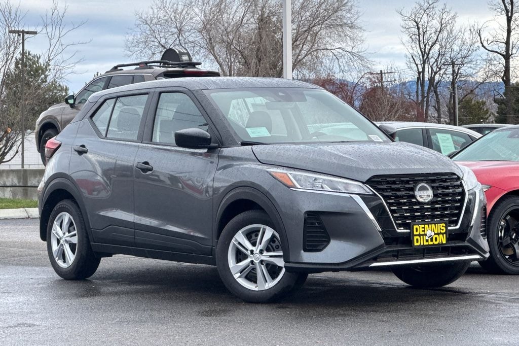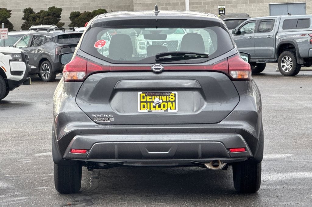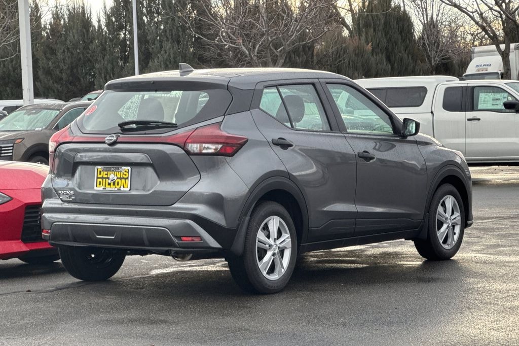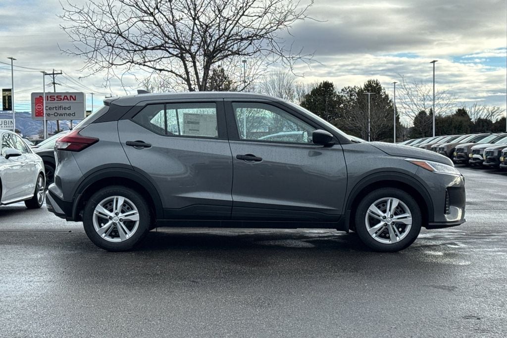Gun Metallic 2025 Nissan Kicks Play S 4D Sport Utility FWD CVT 1.6L 4-Cylinder DOHC 16V 16" Steel Wheels with Full Covers, 6 Speakers, ABS brakes, Air Conditioning, AM/FM Audio System, AM/FM radio, Apple CarPlay/Android Auto, Auto High-beam Headlights, Blind Spot Warning, Brake assist, Bumpers: body-color, Carpeted Floor Mats with Cargo Mat, Center Armrest with Storage, Cloth Seat Trim with Single Stitch, Door Pocket Light, Driver door bin, Driver vanity mirror, Driver's Seat Mounted Armrest, Dual front impact airbags, Dual front side impact airbags, Electronic Stability Control, Frameless Auto-Dimming Mirror, Front anti-roll bar, Front Bucket Seats, Front reading lights, Front wheel independent suspension, Fully automatic headlights, Illuminated entry, Interior Ambient Lighting, Interior Electronics Package, Knee airbag, Low tire pressure warning, Occupant sensing airbag, Outside temperature display, Overhead airbag, Panic alarm, Passenger door bin, Passenger vanity mirror, Power door mirrors, Power steering, Power windows, Radio data system, Rear Parking Sensors, Rear reading lights, Rear side impact airbag, Rear window defroster, Rear window wiper, Remote keyless entry, Speed control, Splash Guards Grain (4 Piece), Split folding rear seat, Sport steering wheel, Steering wheel mounted audio controls, Tachometer, Telescoping steering wheel, Tilt steering wheel, Traction control, Trip computer, Universal Remote, Variably intermittent wipers.