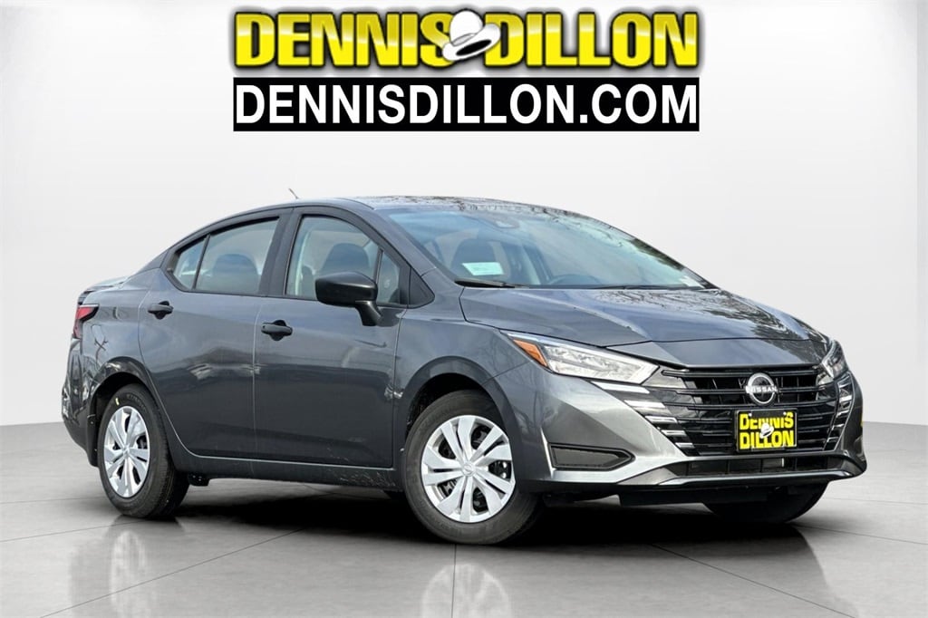 Gun Metallic 2025 Nissan Versa 1.6 S 4D Sedan FWD CVT 1.6L I4 DOHC 16V 15" Steel Wheels w/Full Wheel Covers, 4 Speakers, ABS brakes, Air Conditioning, AM/FM radio, Auto High-beam Headlights, Brake assist, Bumpers: body-color, Carpeted Floor Mats, Cloth Seat Trim, Delay-off headlights, Driver door bin, Driver vanity mirror, Dual front impact airbags, Dual front side impact airbags, Electronic Stability Control, Front anti-roll bar, Front Bucket Seats, Front reading lights, Front wheel independent suspension, Fully automatic headlights, Illuminated entry, Knee airbag, Low tire pressure warning, Occupant sensing airbag, Outside temperature display, Overhead airbag, Panic alarm, Passenger door bin, Passenger vanity mirror, Power door mirrors, Power steering, Power windows, Radio data system, Radio: AM/FM Audio System, Rear Parking Sensors, Rear side impact airbag, Rear window defroster, Shopping Bag Hooks, Speed control, Splash Guards, Steering wheel mounted audio controls, Tachometer, Telescoping steering wheel, Tilt steering wheel, Traction control, Trip computer, Trunk Net, Trunk Package, USB Charging Cable Set, Variably intermittent wipers.